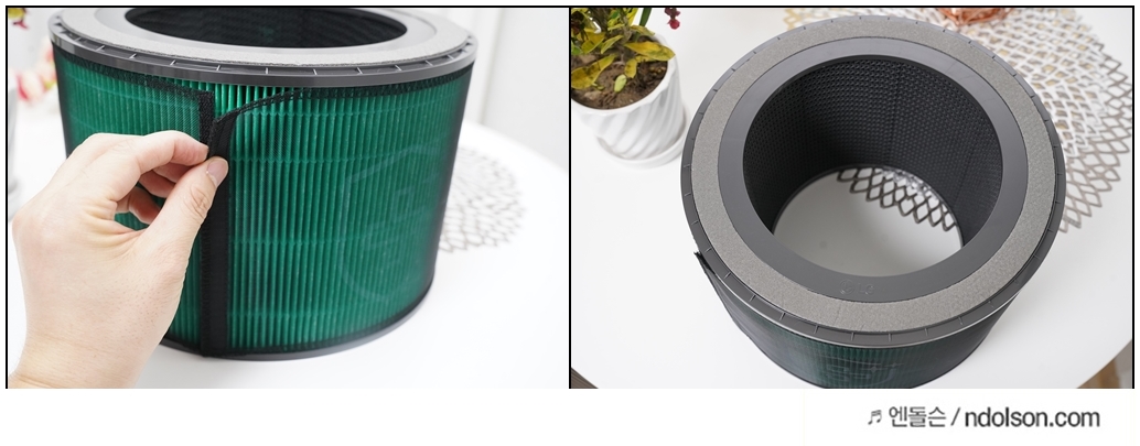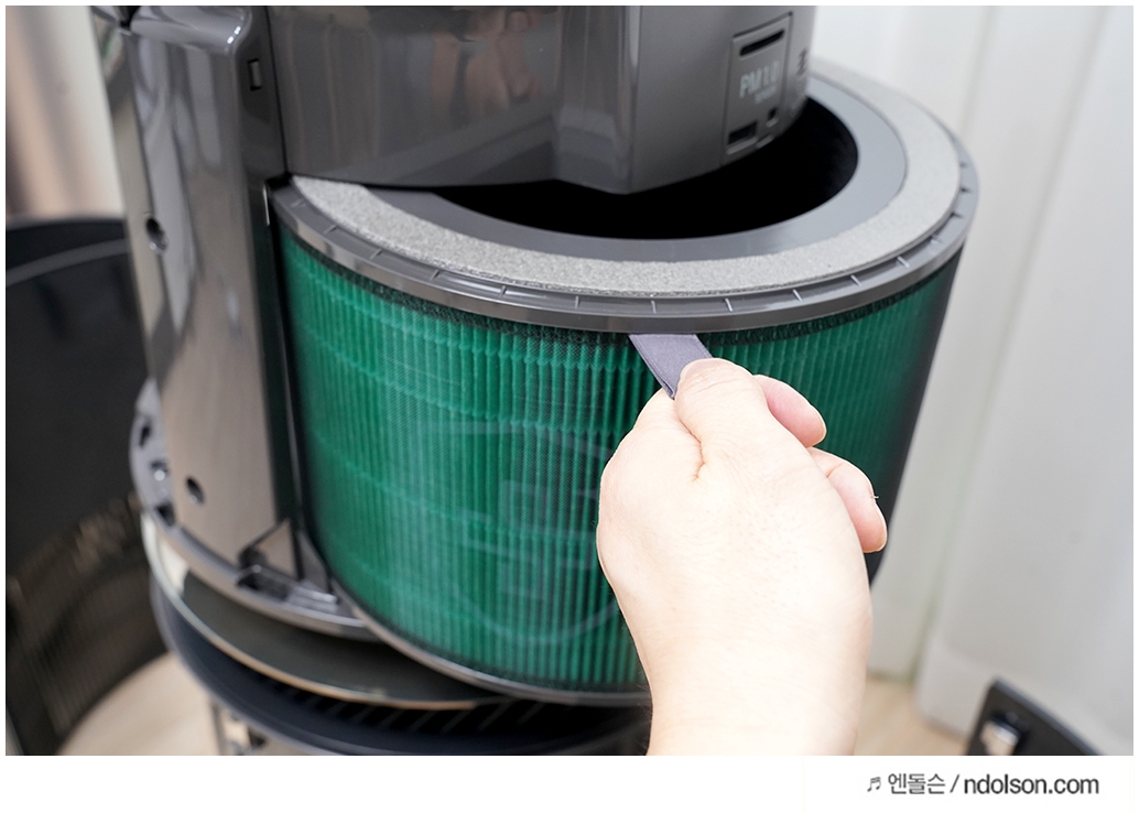 벨크로 타입이라 쉽게 당겨서 LG 퓨리케어 360도 공기청정기 알파의 필터를 분리할 수 있게 되어 있습니다.