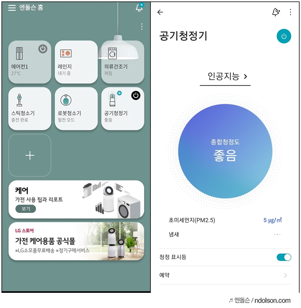 평소 LG 씽큐 앱을 자주 사용하는 데, 이제는 공기청정기도 마음대로 조작할 수 있어 좋습니다. 건조기 다되면 세탁이 끝났다고 푸시 오고, 청소기 충전 다되어도 알려주고 로봇청소기도 원격제어로 청소도 시킬 수 있고 인덕션도 급할 때는 끄거나 제어할 수 있어요.
