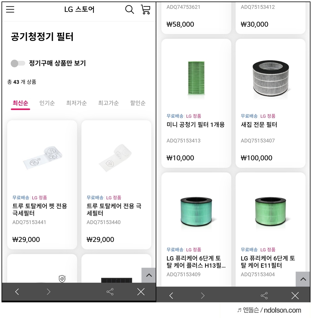필터는 교체 주기가 LG 씽큐 앱에 표시되고 온라인 쇼핑 사이트나 앱에서 바로 구매할 수 있게 제공됩니다.