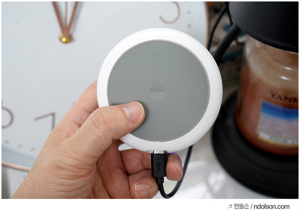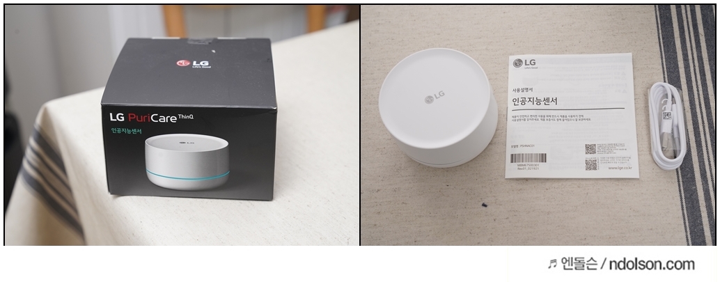 LG 퓨리케어 360도 공기청정기 알파와 같이 사용할 수 있는 인공지능 센서는 USB-C 케이블과 매뉴얼로 구성되어 있씁니다. 하단에는 블루투스 페어링 버튼이 있는데요. 3초 가량 길게 눌러 주어 LG 퓨리케어 360도 공기청정기 알파과 연결할 수 있습니다.