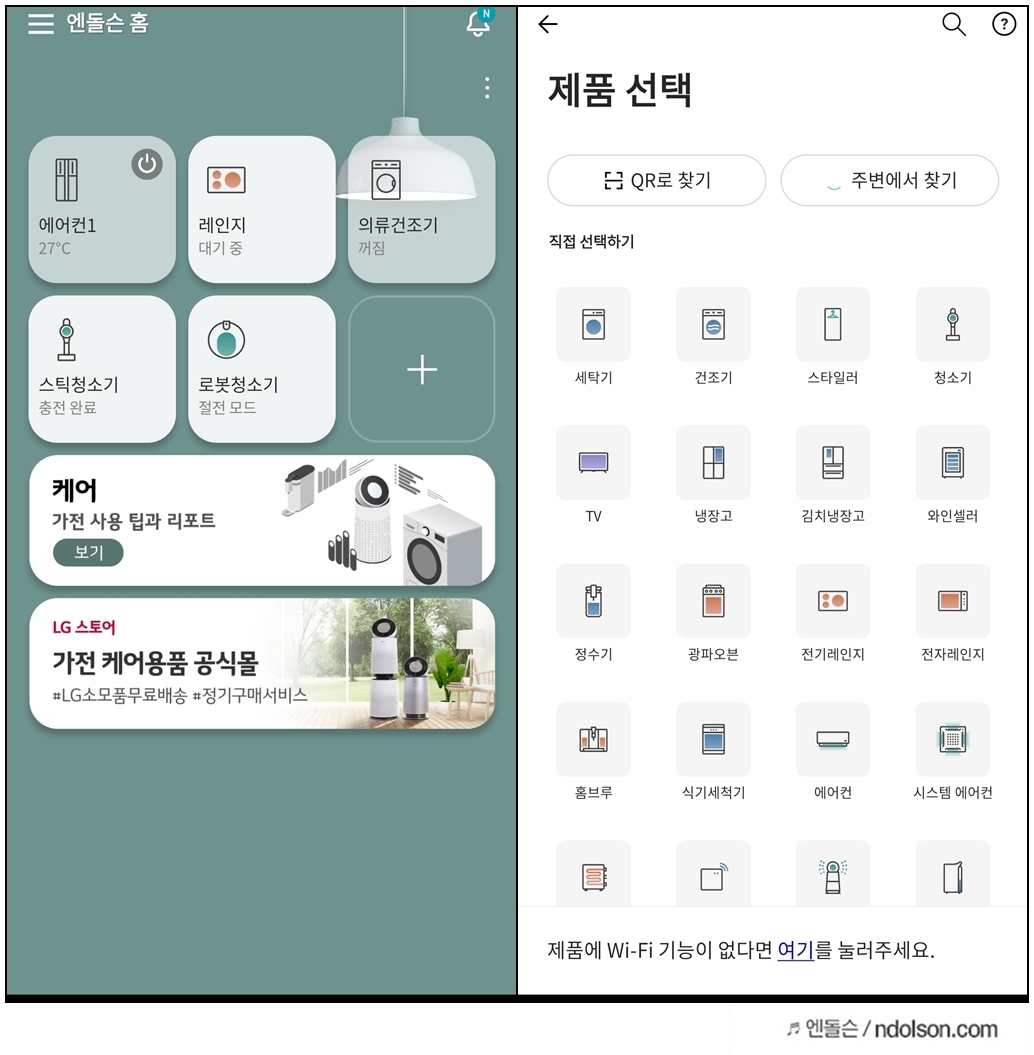 LG 퓨리케어 360도 공기청정기 알파의 앱 연결은 LG 씽큐 앱을 설치 후 연동하시면 됩니다. +를 눌러 공기청정기 카테고리를 선택하여 줍니다.