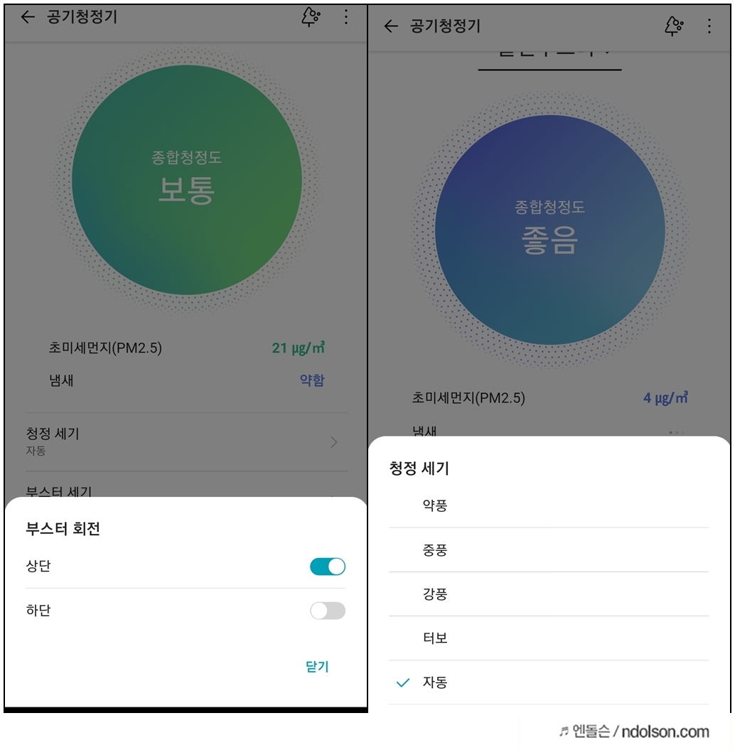앱에서 상단, 하단 부스터 회전을 조작해보았습니다. 상단만 있어도 충분하다면 하단은 회전하지 않는 것이고 상단 고정에 하단만 바람 회전으로 설정할 수 도 있죠.