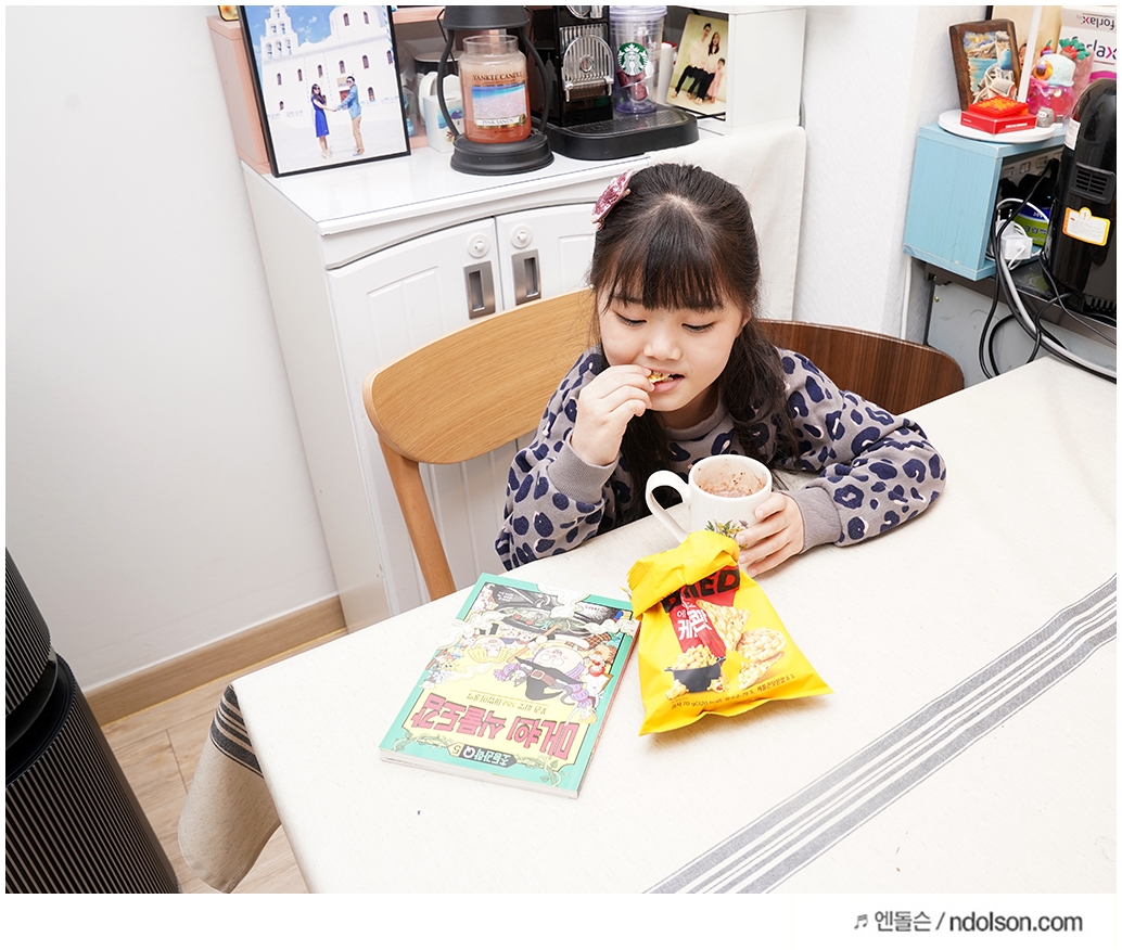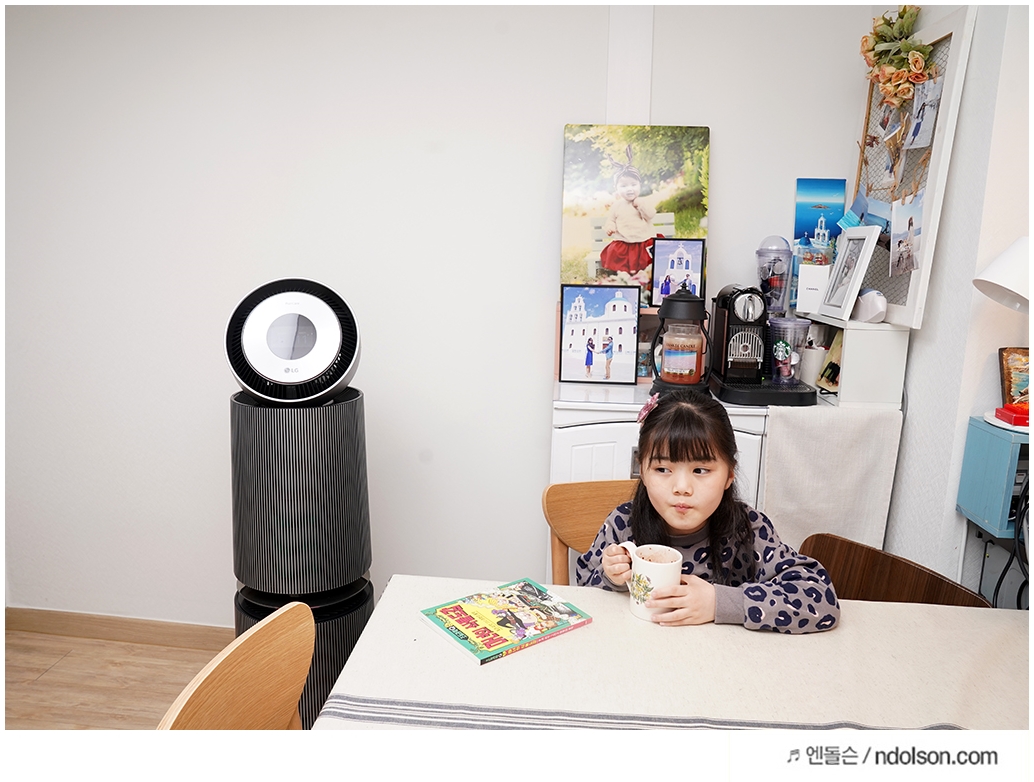 딸아이가 코코아 음료를 먹고 쉽다고 해서 주방에서 타 주고 과자와 함께 주었는데요. 그때 갑자기 LG 퓨리케어 360도 공기청정기 알파가 반응하는 거였어요. 깜짝 놀랐는데요.