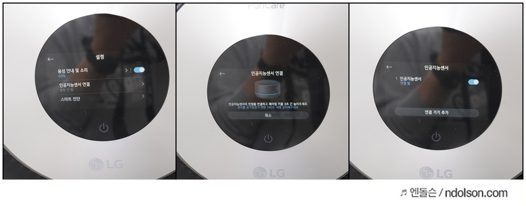 LG 퓨리케어 360도 공기청정기 알파 화면에서 설정 > 인공지능센서 연결을 눌러 줍니다. 그리고 인공지능센서의 하단에 페어링 버튼을 3초가량 눌러 줍니다. 그러면 연결이 됩니다.