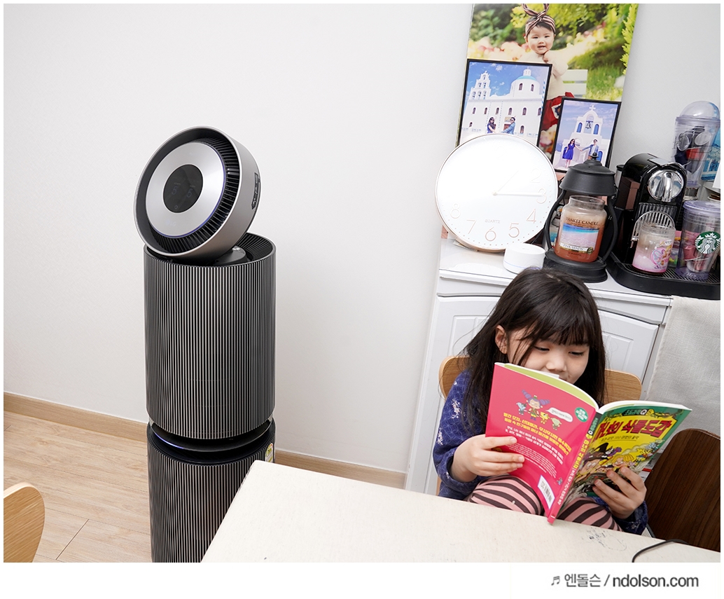 특히 인공지능 모드를 선택하면 공기의 질에 맞추어 집중청정, 분리청정, 싱글청정 가운데 최적의 옵션으로 알아서 하는 것인데요. 글로벌 시험인증기관인 TUV 라인드(TUV Rheinland)가 시험한 결과에 따르면 오토대비 24% 더 빠르고 43% 더 많은 먼지를 정화한다고 하네요. 가전도 인공지능이 대세네요.