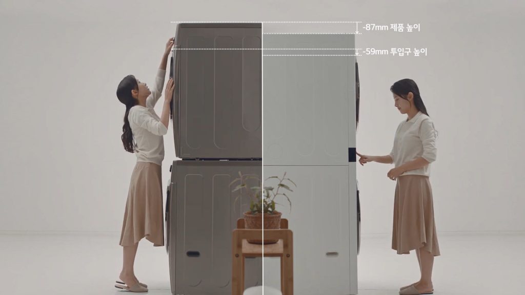 조작부는 상단에 있어야 한다는 고정관념이 없어져 편한 조작이 가능하게 되었는데요. 더구나 세탁과 건조를 따로 하면서도 공간 활용이 개선되었습니다. 동급 드럼세탁기와 건조기를 위아래로 설치할 때보다 약 87mm 줄어들어 공간이 여유가 생겨 다용도실이 여유롭게 보이는 장점도 있네요.