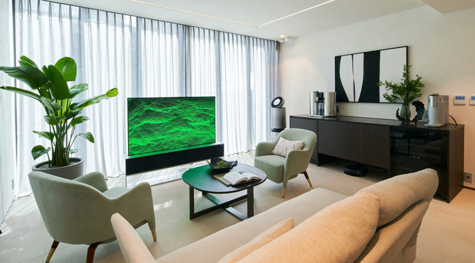 벽이 아닌 공간에 TV를 둘 수 있어 LG 시그니처 올레드 R의 활용성이 높은 것인데요. 창문이 보이는 공간에 둔다면, 제로뷰로 음악 재생이나 시계, 액자 기능으로 즐기면서 시야를 가리지 않아 창밖의 뷰를 감상할 수 있다는 것이죠. 또 게임을 즐기거나 TV를 즐기고 싶다면 LG 시그니처 올레드R를 꺼내 보는 것인데요.