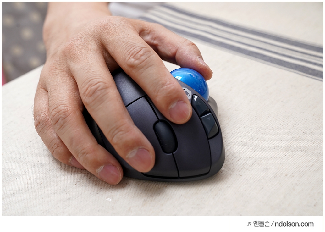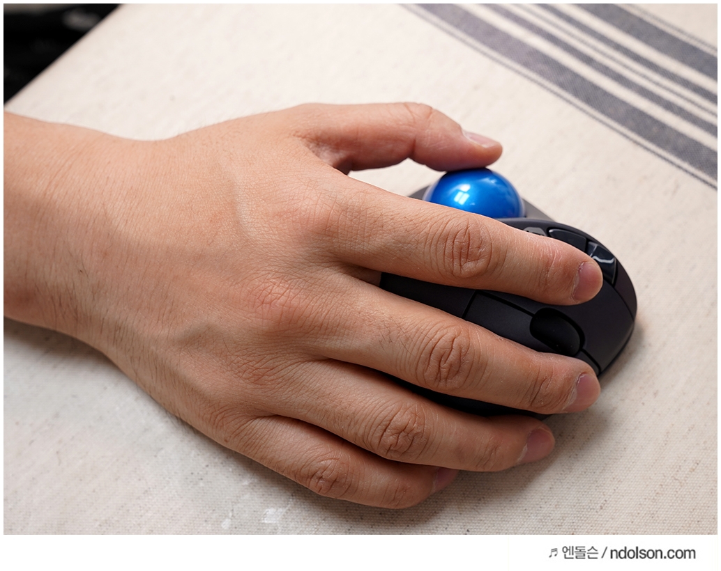 그런 점에서 손목에 무리가 적은 트랙볼 마우스를 써보는 것이 좋다고 생각됩니다. 인체공학적인 설계뿐 아니라 손과 팔을 고정한 상태로 움직이지 않고도 마우스 조작이 가능하기 때문인데요.