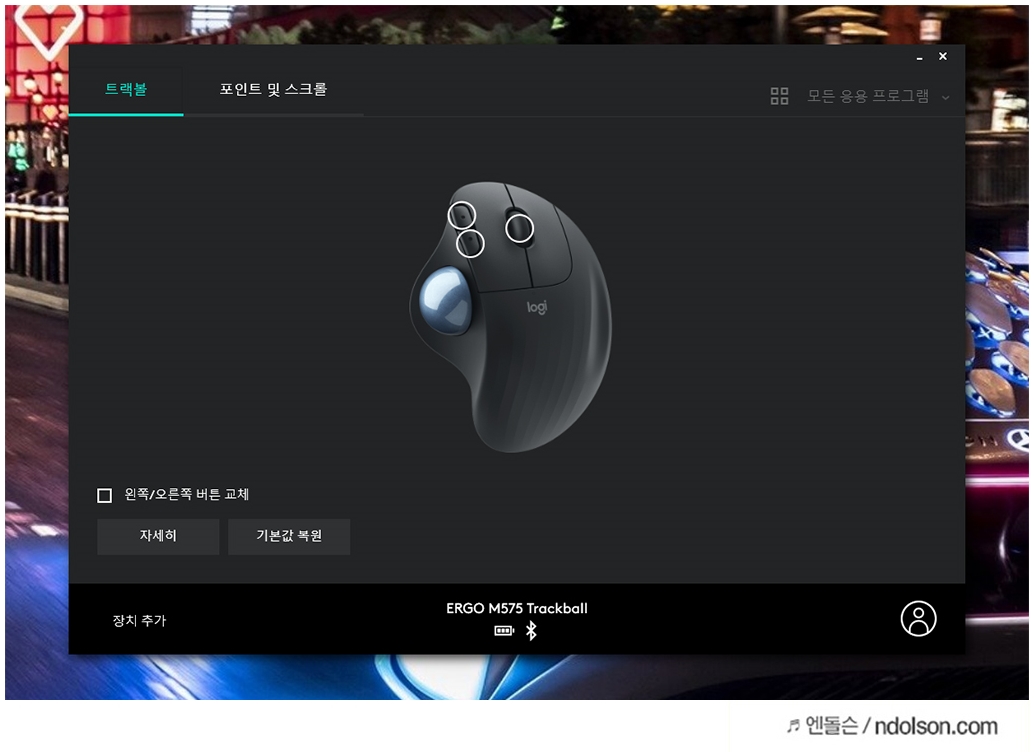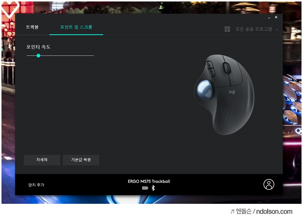 사용자의 편의에 맞게 커스터마이징할 수 있는데 로지텍 ERGO M575 트랙볼 마우스는 DPI 400 공정치에서 최대 2000 설정이 가능합니다. 또 사용하는 응용프로그램들에 따라 포토샵, 엑셀, 웹서핑, 영상편집 툴(파워디렉터 등)에 따른 개별 설정을 해둘 수 있어 유용합니다.