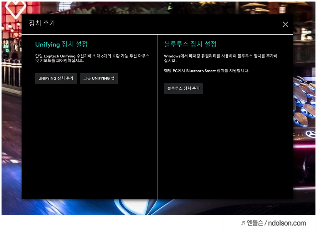 또 로지텍 옵션 프로그램 설치 후, Unifying USB수신기 장치를 추가할 수 있습니다. 장치 추가 후, 스위치를 OFF에서 ON으로 해주면 추가됩니다.
