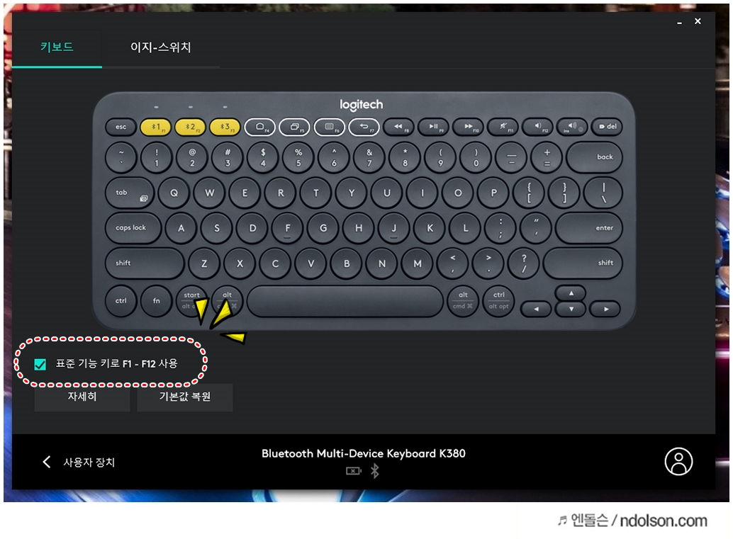 로지텍 K380 무선 키보드를 선택 후, 컨스터마이징 할 수 있습니다. 표준 기능 키로 F~F12 사용을 체크해주면, 표준 기능키로 사용할 수 있습니다.
