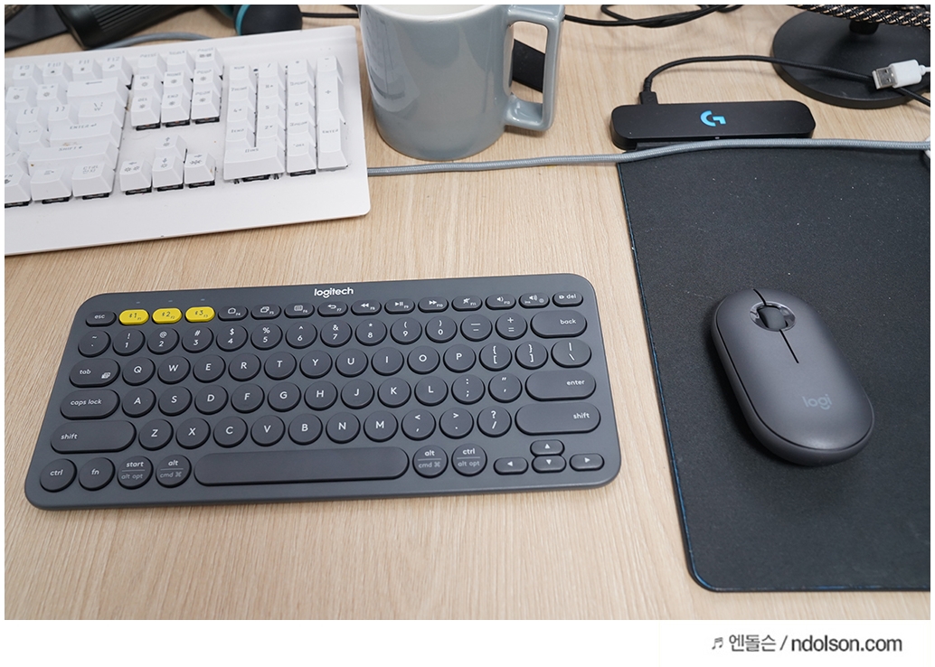 로지텍 K380 무선 키보드와 로지텍 퍼블 마우스로 구성하면 무소음에 무선의 편리함을 누릴 수 있습니다.