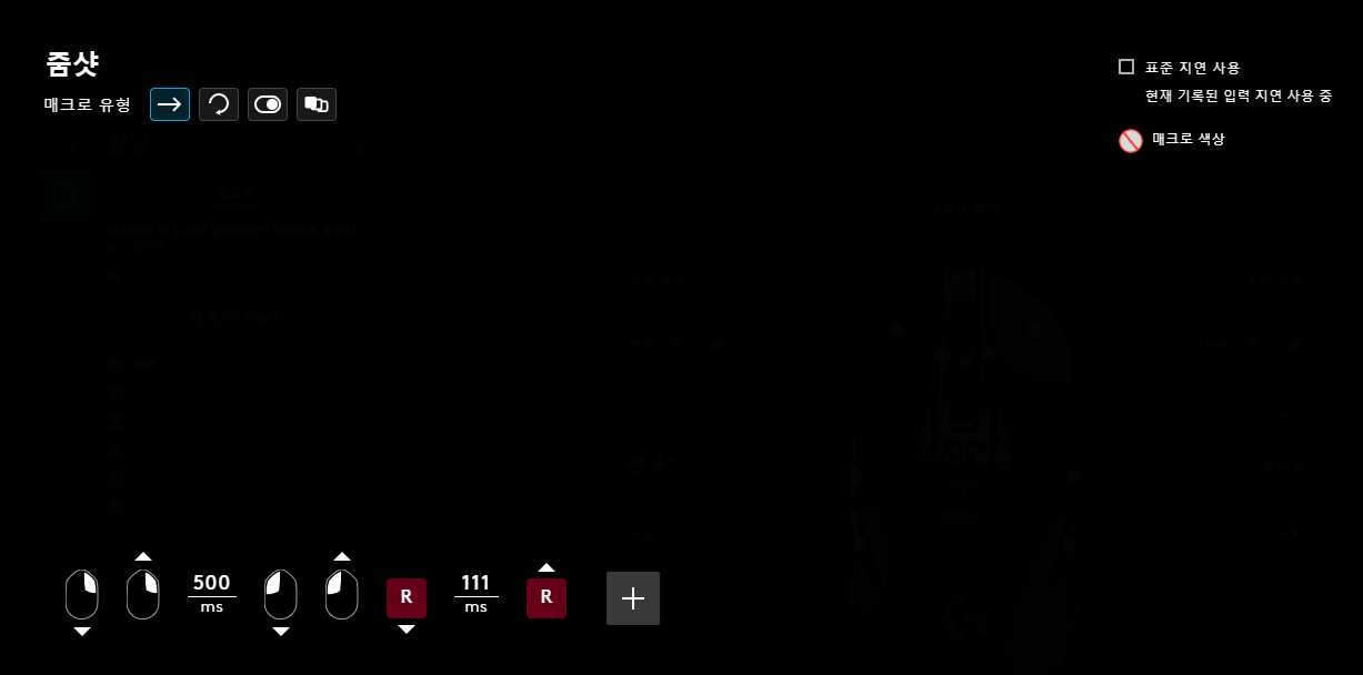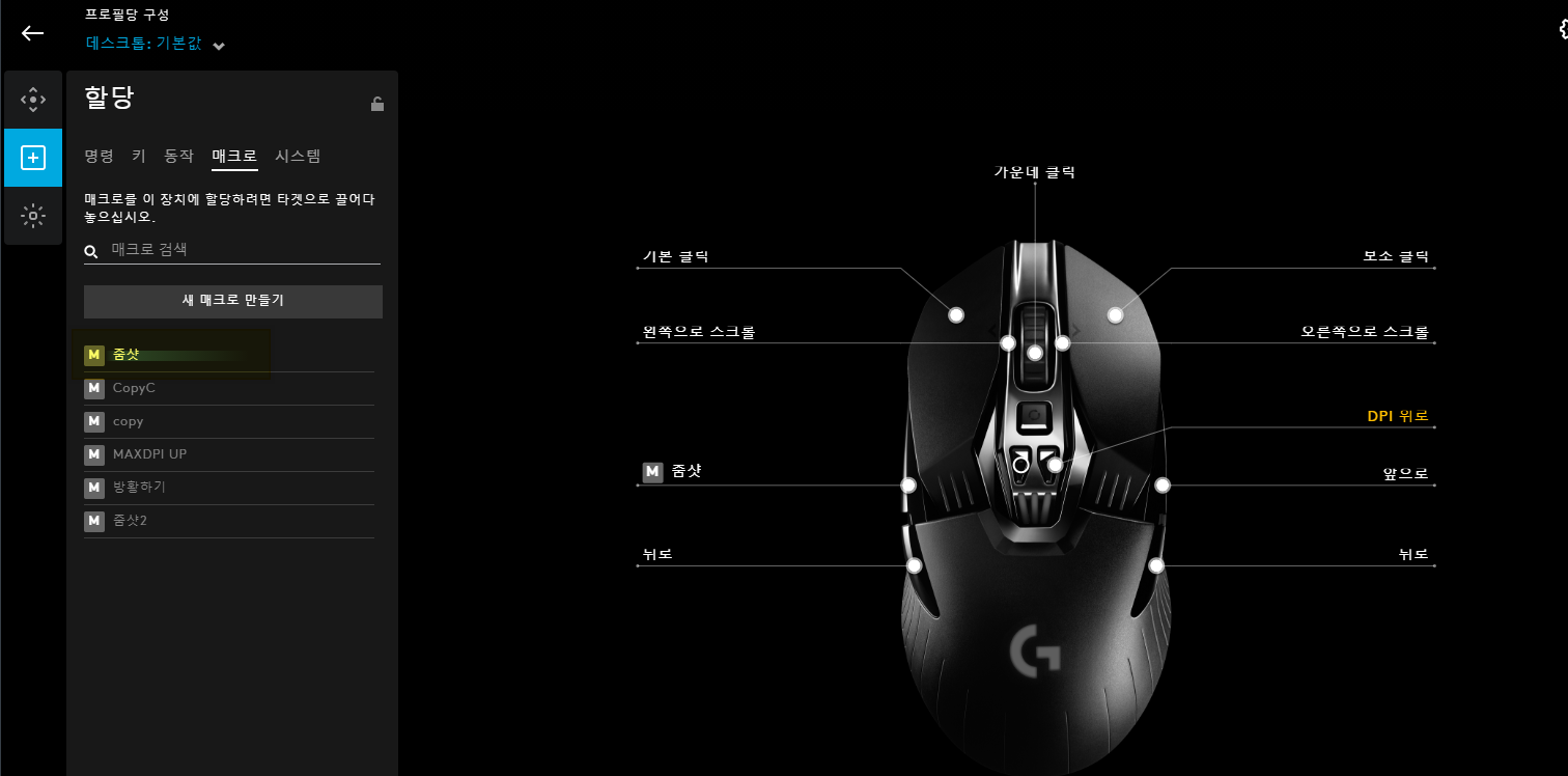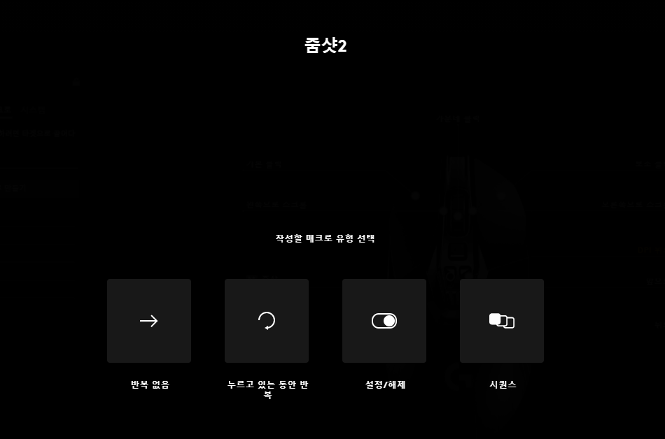 그리고 배그할 때 줌 샷 연사하고 싶다면 마우스 매크로를 만들어 써보는 것도 좋은데요. 로지텍 G HUB의 할당에서 매크로를 선택하고 작성할 유형을 고르면 됩니다.