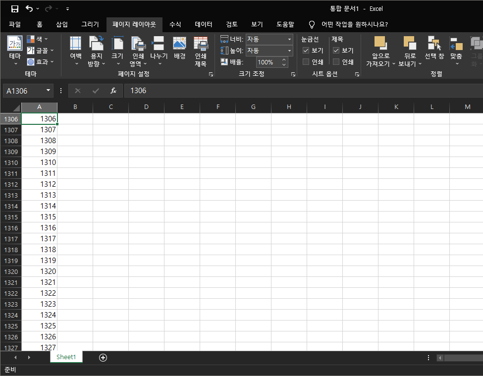 그리고 무한 휠, 초고속 스크롤은 고급 마우스에만 있는 놀라운 기능인데요. 엑셀에서 한번 무한 휠로 스크롤 했는데 1306까지 내렸네요.