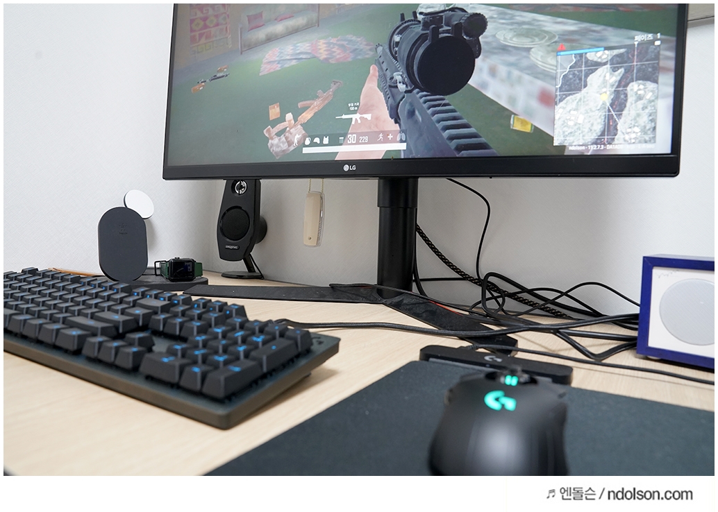 로지텍 LIGHTSYNC를 이용하면 로지텍 장비들끼리 RGB 동기화가 가능합니다. 동기화는 고정, 사이클, 브리딩, 화면 샘플러, 오디오 비주얼라이저의 효과를 설정할 수 있는데요. 사이클로 해서 색상이 계속 바뀌게 설정했는데요. RGB가 1680만 컬러로 원하는 느낌의 분위기로 장비들의 깔맞춤하기 아주 좋은 기능입니다.