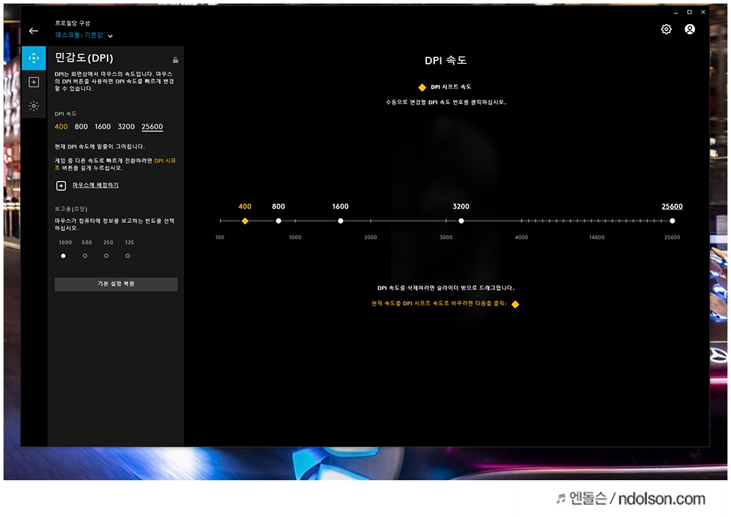 하지만 정확한 조준을 하기 위해서는 너무 마우스 포인트가 빠르면 조준이 힘듭니다. DPI를 낮추어야 하는데, 100~400까지 DPI 조정이 가능합니다. 빠르게 DPI를 25600까지 올리고 바로 낮출 수 있는 것은 마우스의 단축키 설정으로 가능한데요.