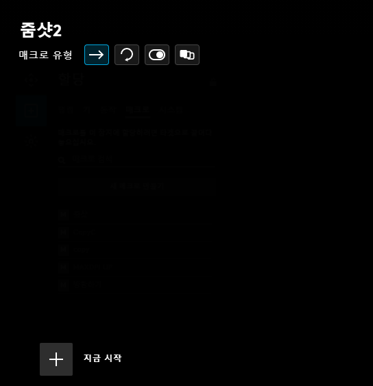 그리고 배그할 때 줌 샷 연사하고 싶다면 마우스 매크로를 만들어 써보는 것도 좋은데요. 로지텍 G HUB의 할당에서 매크로를 선택하고 작성할 유형을 고르면 됩니다.