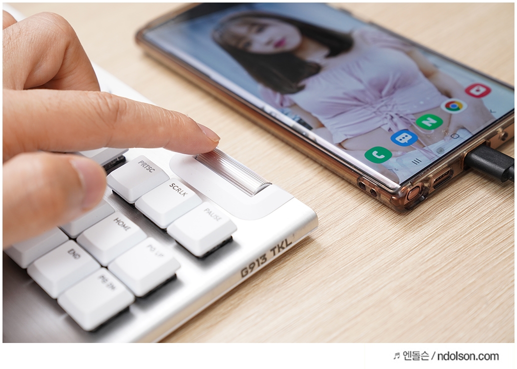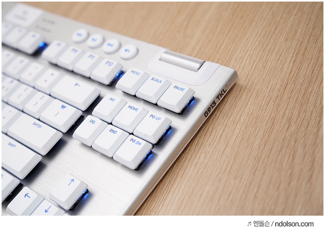 또 우측 상단에는 볼륨 조절을 할 수 있는 휠이 위치하고 있습니다. 측면에는 G913 TKL 각인이 보입니다.
