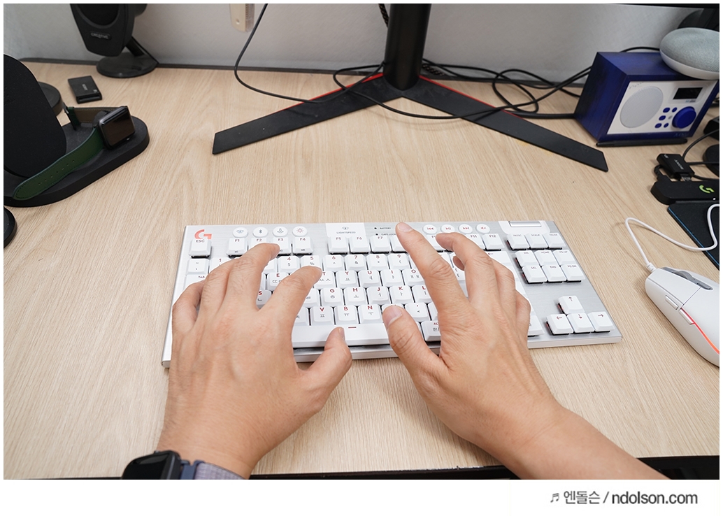 개인적으로 G913 TKL 화이트 키보드에 사용한 새로운 고성능 로우 프로파일 GL 기계식 스위치가 게임이나 타이핑을 할 때 빠르고 정확한 타이핑을 하기에 좋은 성능을 보여주었습니다. 기계식 키보드 중에서 무선 환경으로 무엇이 좋을까 고민이신 분에게 만족감을 줄 제품입니다.