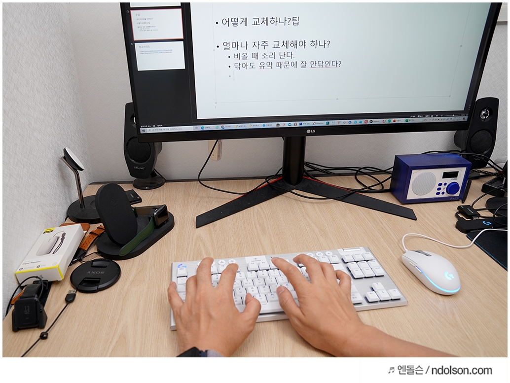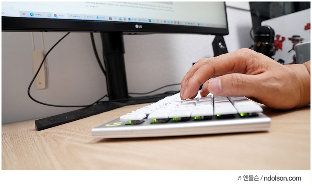 주변에 큰 소음을 주지 않게 조용한 키감을 보여줍니다. 타건하는 재미가 있는 촉각 피드백을 제공해서 좋았습니다.