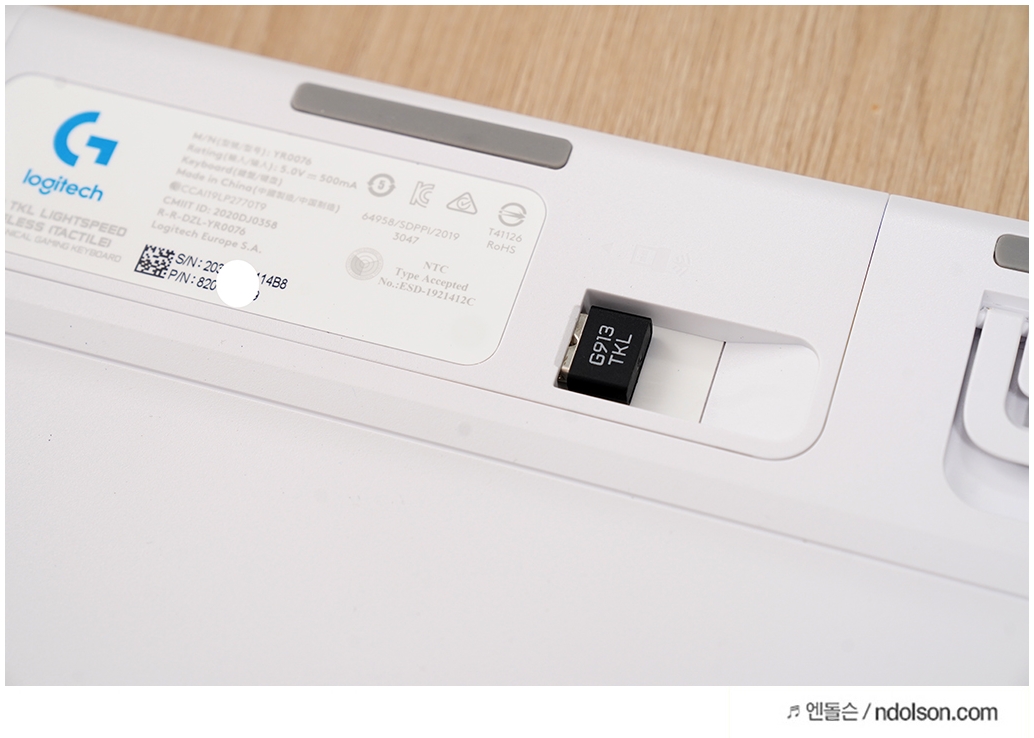 키보드의 후면에는 USB 리시버를 보관할 수 있는 공간이 있습니다. 블루투스 또는 USB 리시버를 사용하여 무선 연결을 할 수 있습니다.