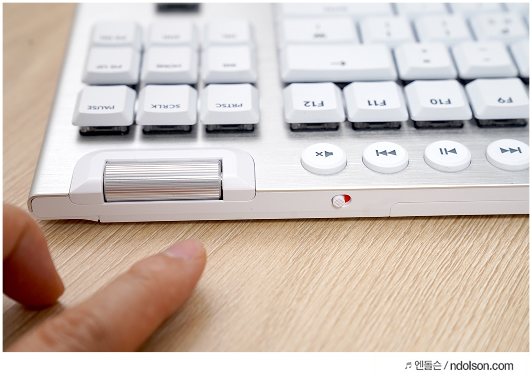 키보드의 우측 상단에는 다수의 기능키와 버튼 휠이 있는데요. 음악/동영상 재생을 하다가 다음 곡으로 넘길 때 요긴합니다. 또 휠은 직관적이라 돌려서 볼륨 조절도 가능합니다.