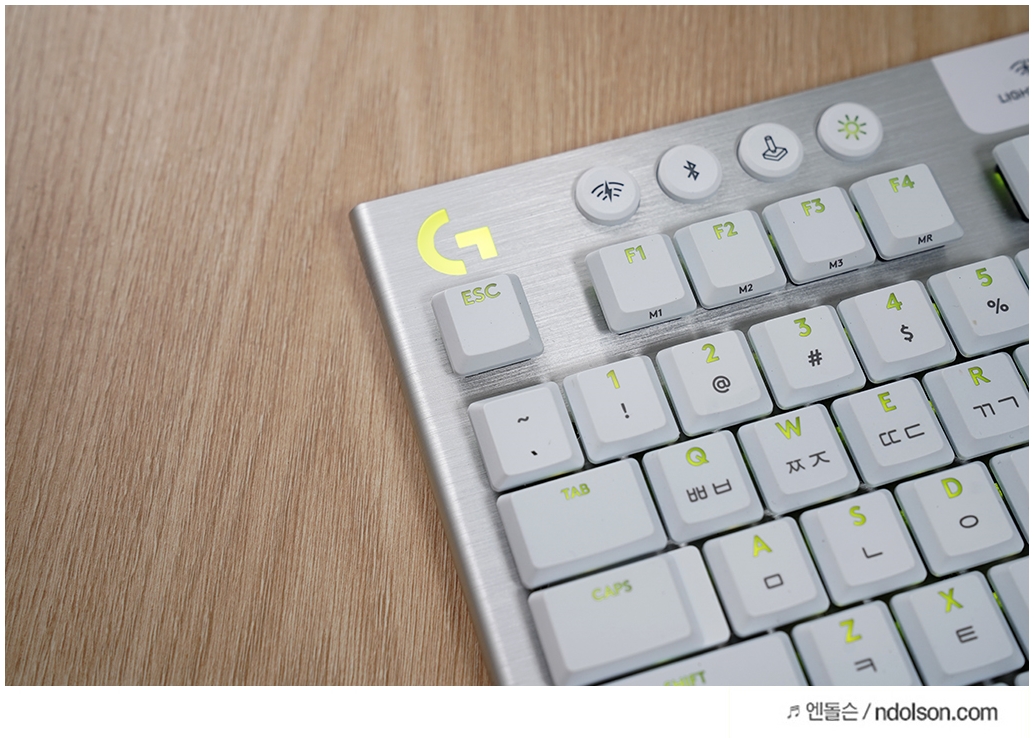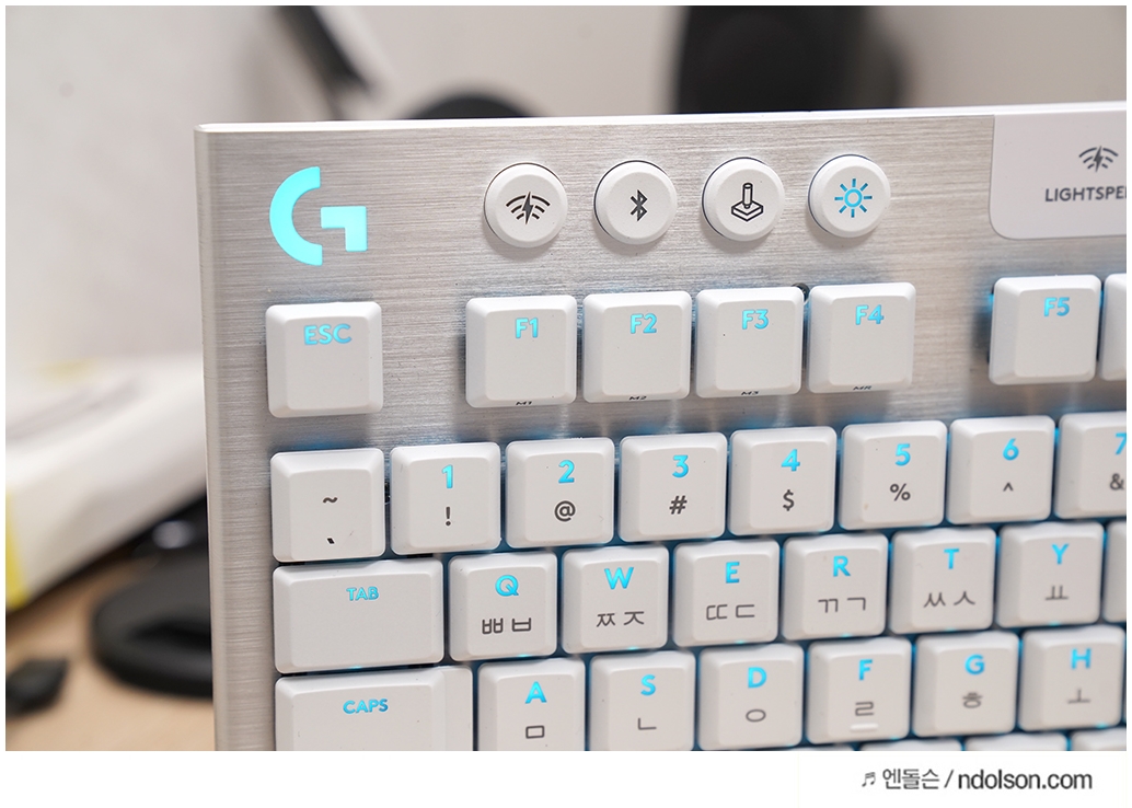 이중 무선 연결이 지원되는 로지텍 G913 TKL 화이트는 왼쪽 상단에 LIGHTSPEED 무선 연결 버튼과 블루투스 버튼이 있습니다. 또 옆에는 게임모드와 RGB 변경 버튼이 위치하고 있는데요.