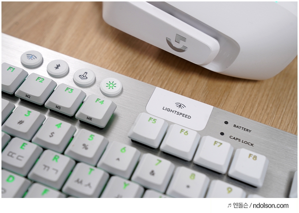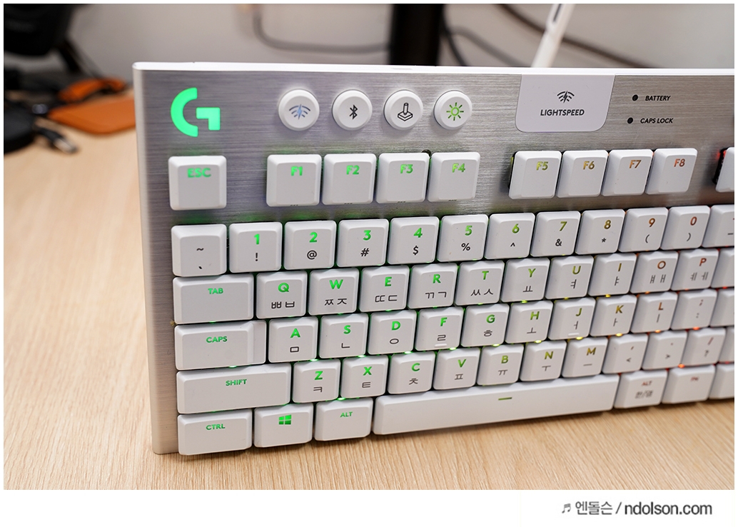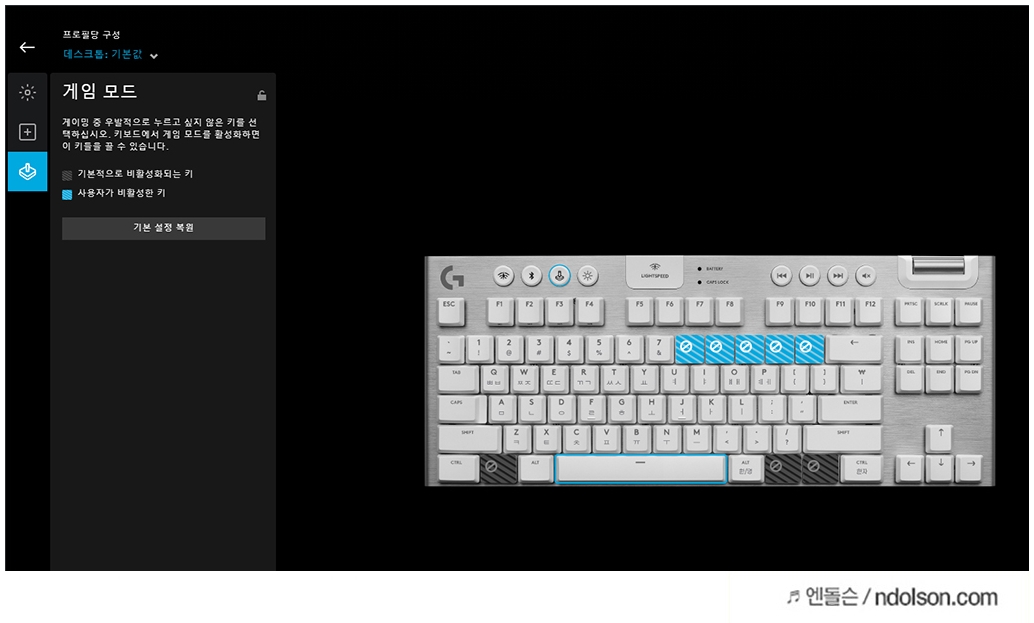 또 게임을 즐길 때 로지텍 G913 TKL는 왼쪽 상단의 게임모드를 선택하여 게임과 무관한 키가 눌리지 않게 설정할 수 있습니다. 게임할 때 잘못 키를 눌러 귀찮은 일을 만들지 않을 수 있어 좋습니다.