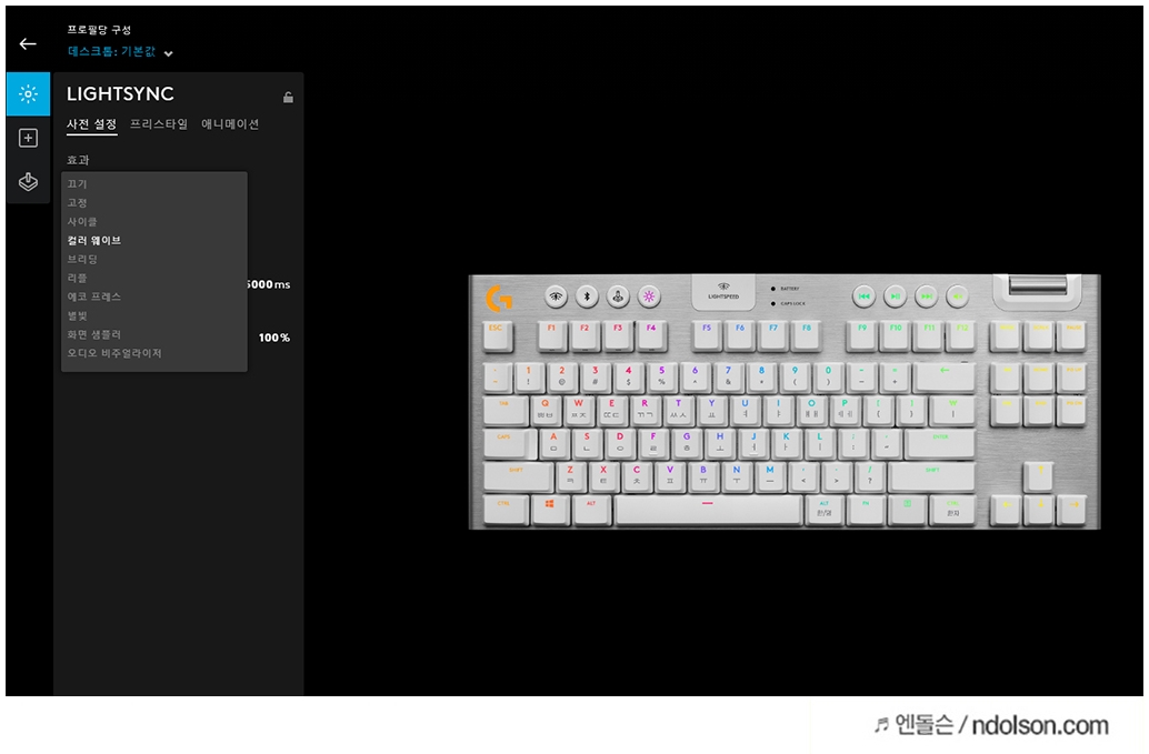 로지텍 G913 TKL의 화려한 RGB효과를 위해서 LIGHTSYNC 효과 설정이 가능합니다. 고정된 색상이나 컬러 웨이브를 통해서 게이밍키보드의 멋진 모습으로 바꾸어 볼 수 있습니다.