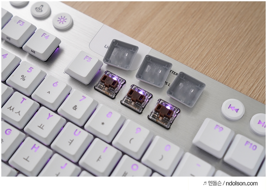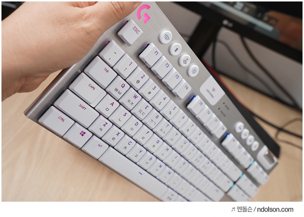 또 기계식 키보드라는 장점도 있었습니다. 로지텍 G913 TKL 화이트의 특징이라면, 로우 프로파일 기계식 키보드로 일반 기계식 키보드보다 높이가 좀 낮습니다. 낮긴 해도 펜타그래프 보다 높습니다. 이전에도 기계식 키보드를 사용하였는 데 딱히 불편함을 느끼는 것은 없었고 키 모양 덕분인지 오히려 서걱거림 같은 것도 없었습니다. 참고하세요.