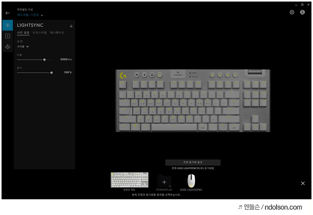 로지텍 G913 TKL 화이트 키보드와 게이밍마우스 G102 화이트를 LIGHTSYNC 동기화를 하였습니다.