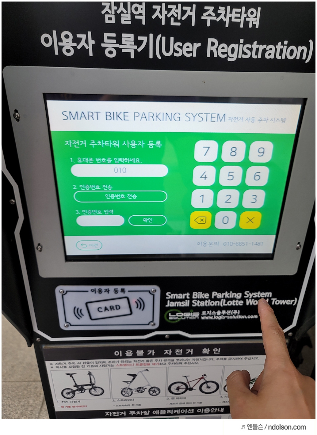 잠실 자전거 주차타워는 주차/출차로 나뉘여서 1호기, 2호기로 구분됩니다. 주차에 가서 사용하시면 되는데, 사진상에서 왼쪽 끝에 (주차 옆에 가면) 처음 사용자를 위한 회원 가입하는 단말기가 있습니다.