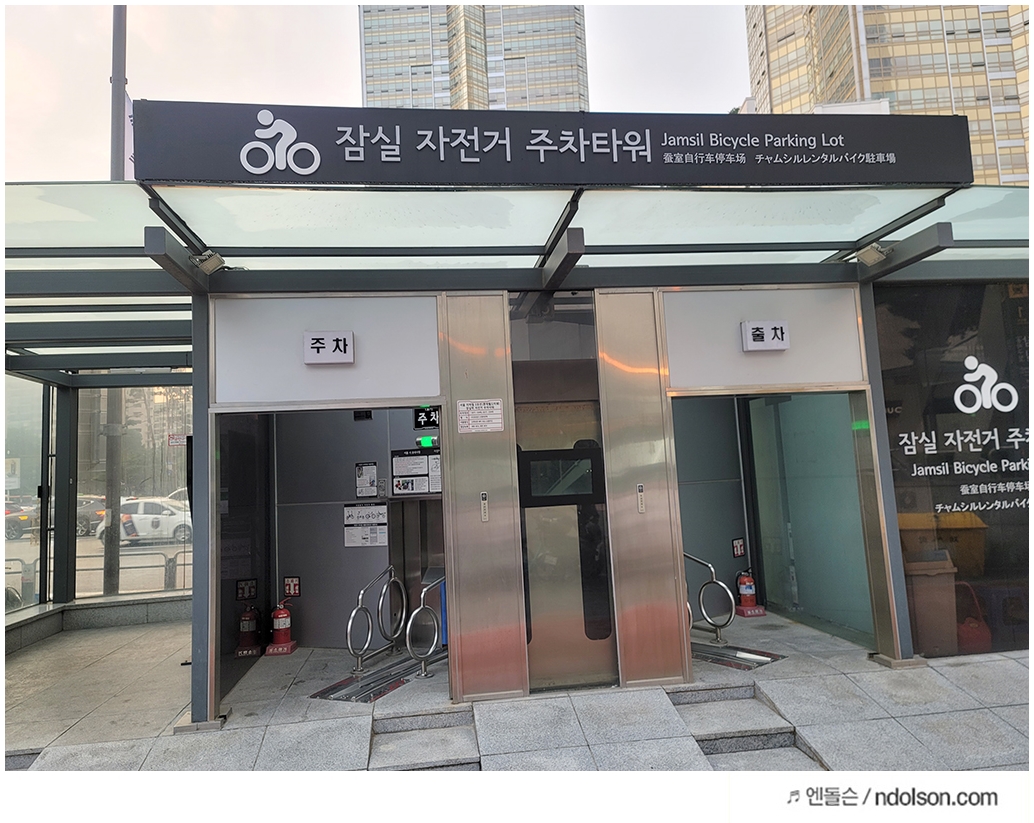 잠실역에 있는 롯데월드몰을 찾아가면 됩니다. 1번 출구 앞에 자전거 공용 주차장이 있습니다. 자동차 자동 주차 시스템처럼 자전거도 이렇게 쏙 잡고 들어가서 주차를 시켜 줍니다.