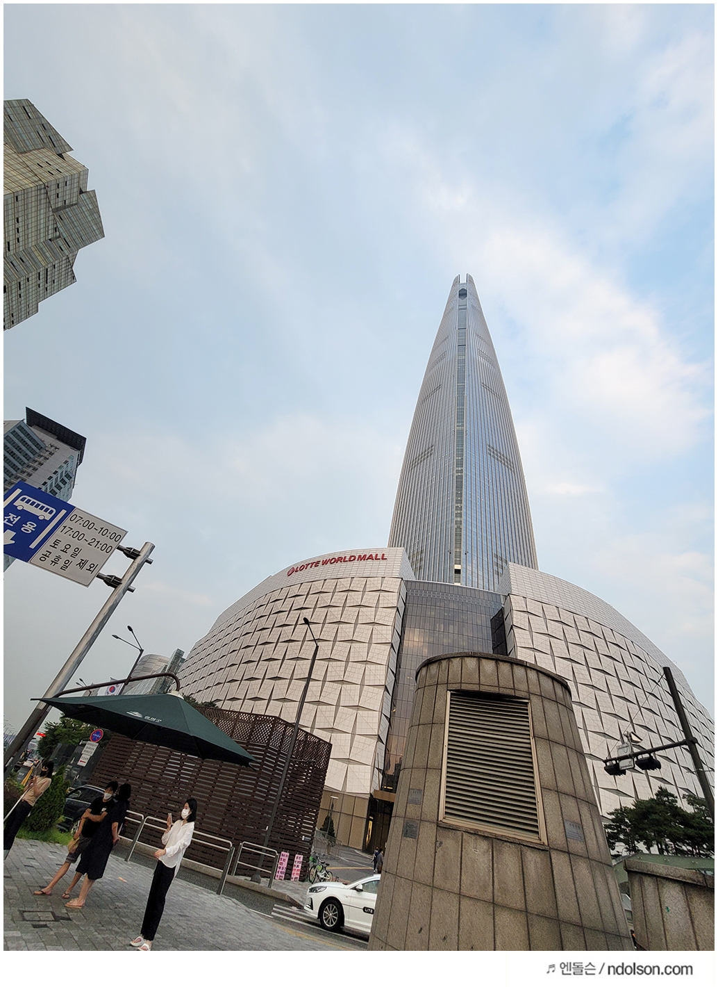 멀리서도 보이는 마요네즈 통 닮은 잠실롯데몰 앞에 잠실 자전거 주차타워가 있습니다.