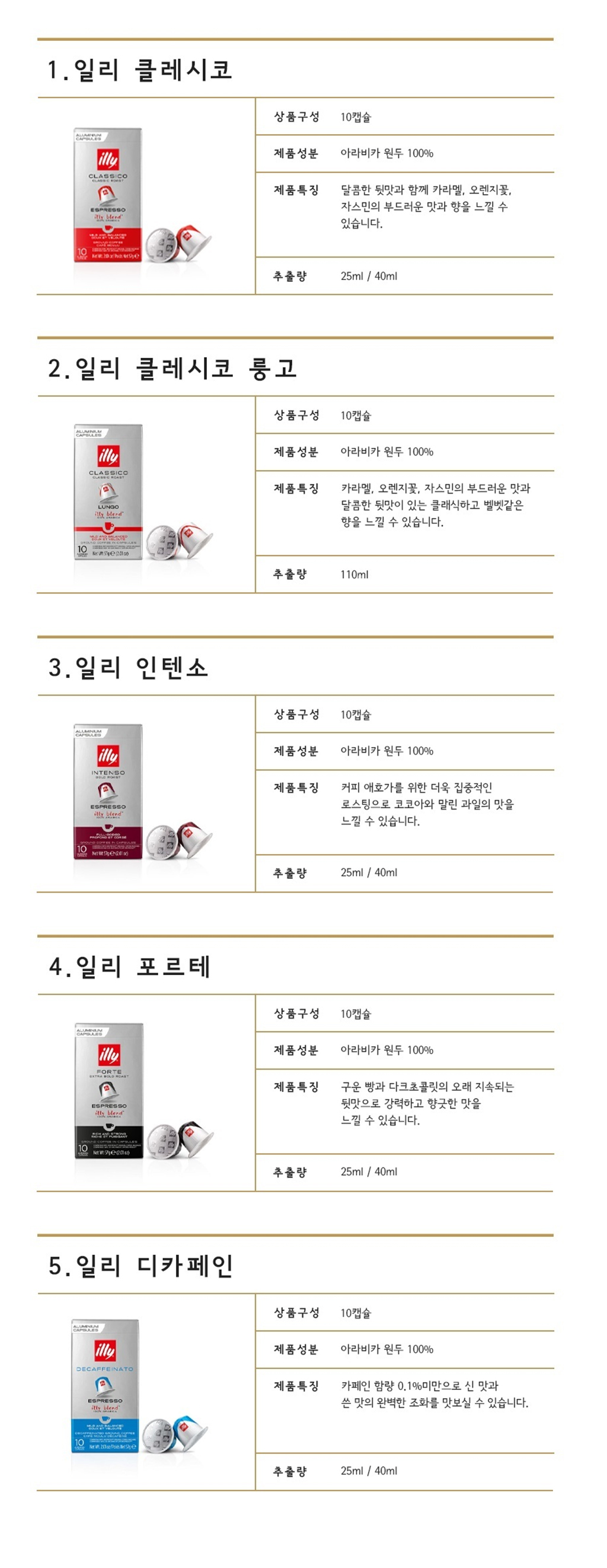 일리 클레시코, 일리 클레시코 룽고, 일리 인텐소, 일리 포르테, 일리 디카페인 모두 각각의 카페인 함량과 산미가 다르기 때문에 즐기는 재미가 크다. 참고로 디카페인은 커피 함량이 0.1% 미만으로 커피를 못먹는 분이라도 괜찮다.
