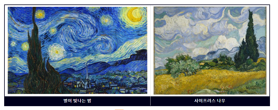 고흐의 작품으로는 별이 빛나는 밤, 시이프러스 나무, 까마귀가 나는 밀밭 등이 있는데요.
