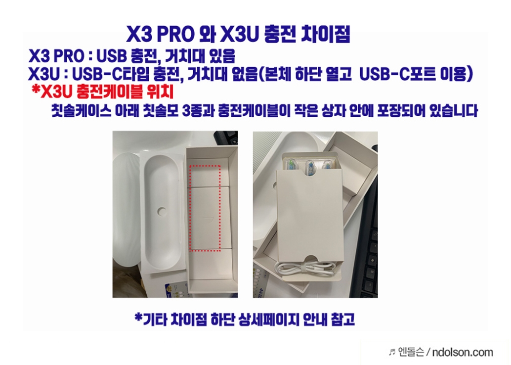 샤오미 전동칫솔 X3U 와 X3 PRO와의 차이라고 보시면 됩니다. 좋게 보면 전동칫솔의 배터리가 오래가기 때문에 유선 충전도 나쁘지 않다라고 볼 수 있고, 반대로 무선충전이 기본인데 없어 불편하다고 생각됩니다.