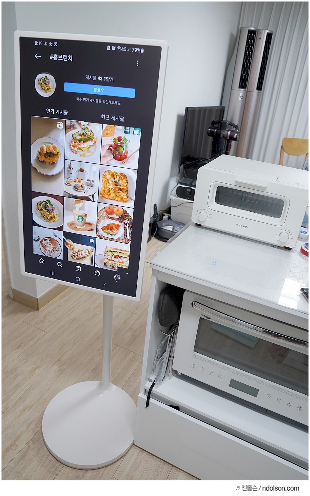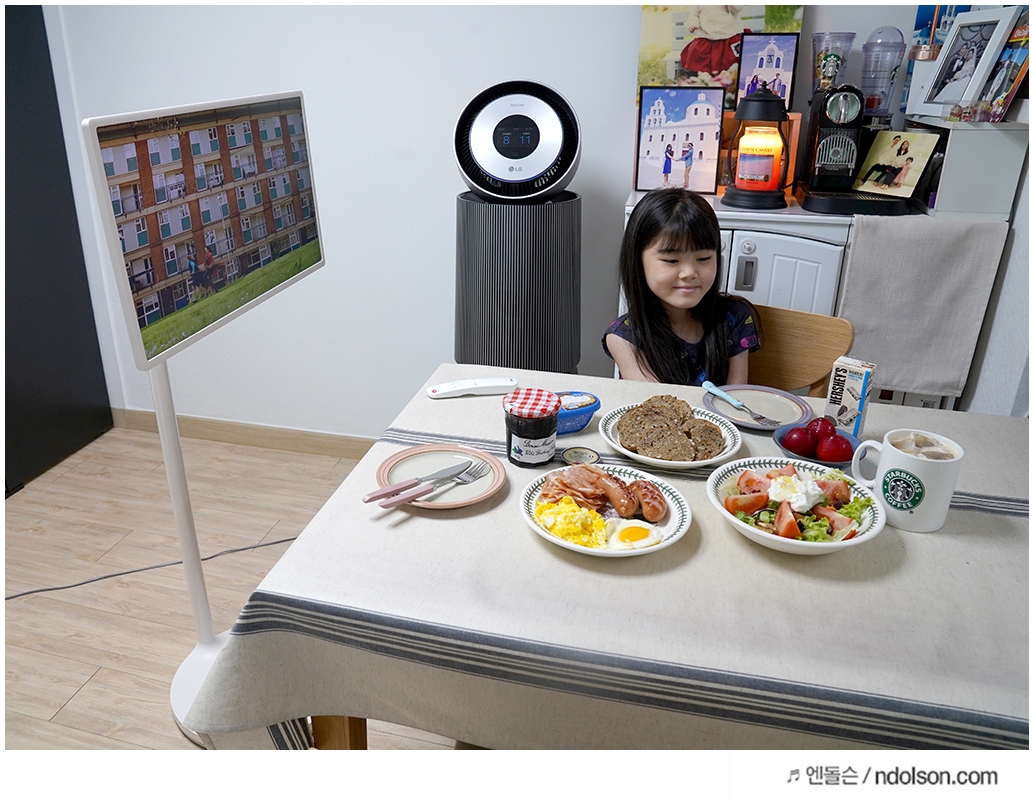 식탁에서 스마트폰으로 영상을 보다가 27인치의 큰 화면인 LG 스탠바이미로 보니깐 훨씬 좋네요. 또 식탁에서 등지고 TV 보는 것보다 같이 보기도 좋습니다.