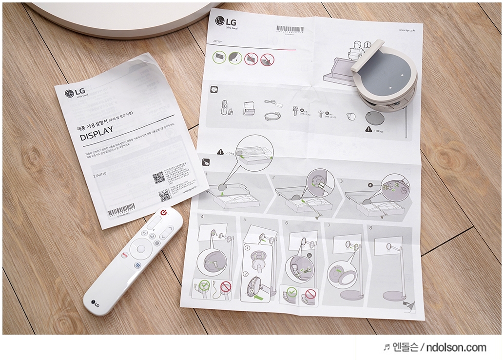 LG 스탠바이미의 제품의 구성품으로 매뉴얼과 리모컨, 집개형 스마트폰 거치대가 있습니다.