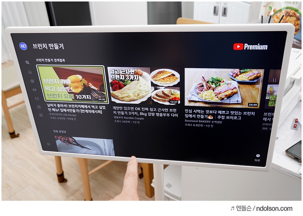요즘은 백종원 선생님도 요리 꿀팁을 유튜브 영상을 남겨주셔서 어린이들에게 큰 힘이 되는데요. LG 스탠바이미는 공간 제약이 없어 부엌으로 끌고 와 영상을 보면서 요리를 할 수 있어 좋네요.