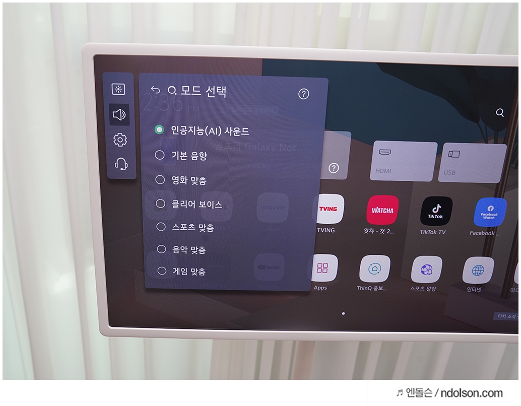 LG 스탠바이미 화면은 전문가 모드가 낮/밤으로 구분되어 있고 선명한 화면, 영화 맞춤, 게임 맞춤 등으로 조작할 수 있습니다. 음향은 LG TV처럼 인공지능(AI)사운드가 지원돼서 변경해보았습니다.