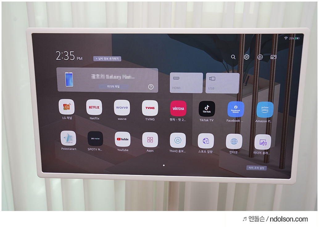 LG 스탠바이미의 홈 화면입니다. Web OS가 내장되어 유튜브, 넷플릭스, LG채널, 왓챠, 아마존 프라임, 웨이브(Wave), 페이스북 Watch 등의 앱을 즐길 수 있습니다.