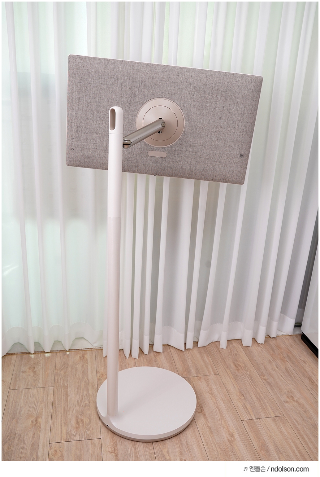조립이 끝난 LG스탠바이미의 모습입니다. 화이트한 카밍베이지 색상이 깔끔하고 무빙스탠드라 모니터가 달린채로 이동이 가능하네요.