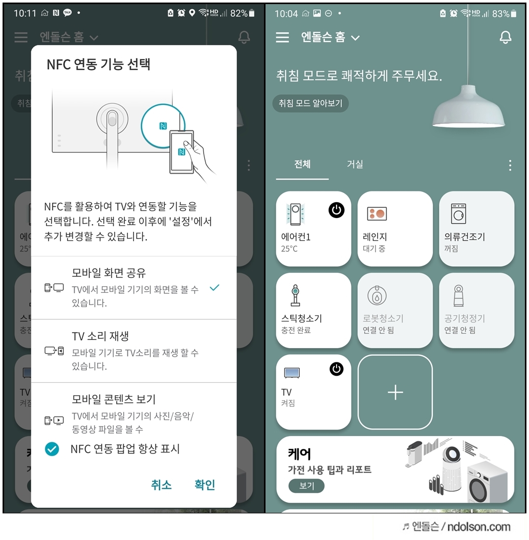 스마트폰을 연결하는 방법은 간단한데요. 스마트폰의 NFC 기능을 켜고 후면에 가져다 되면 왼쪽 캡처처럼 연결이 됩니다. 또 연결 후에는 LG ThinQ 앱에서 스마트폰으로도 제어가 가능하고, 스마트폰 미러링을 통해서 화면 공유를 해서 무선으로 LG 스탠바이미를 보면서 게임이나 앱 구동 화면을 보면서 즐길 수 있습니다.