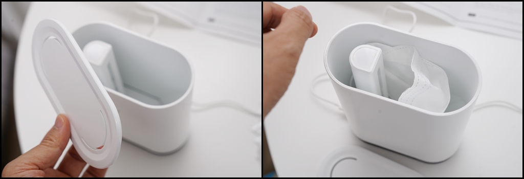 마스크살균기 MASKCARE에 마스를 넣고 뚜껑을 덮으면 자동 센스가 동작합니다. 또는 측면 수동 버튼을 눌러 동작시킬 수 있습니다.