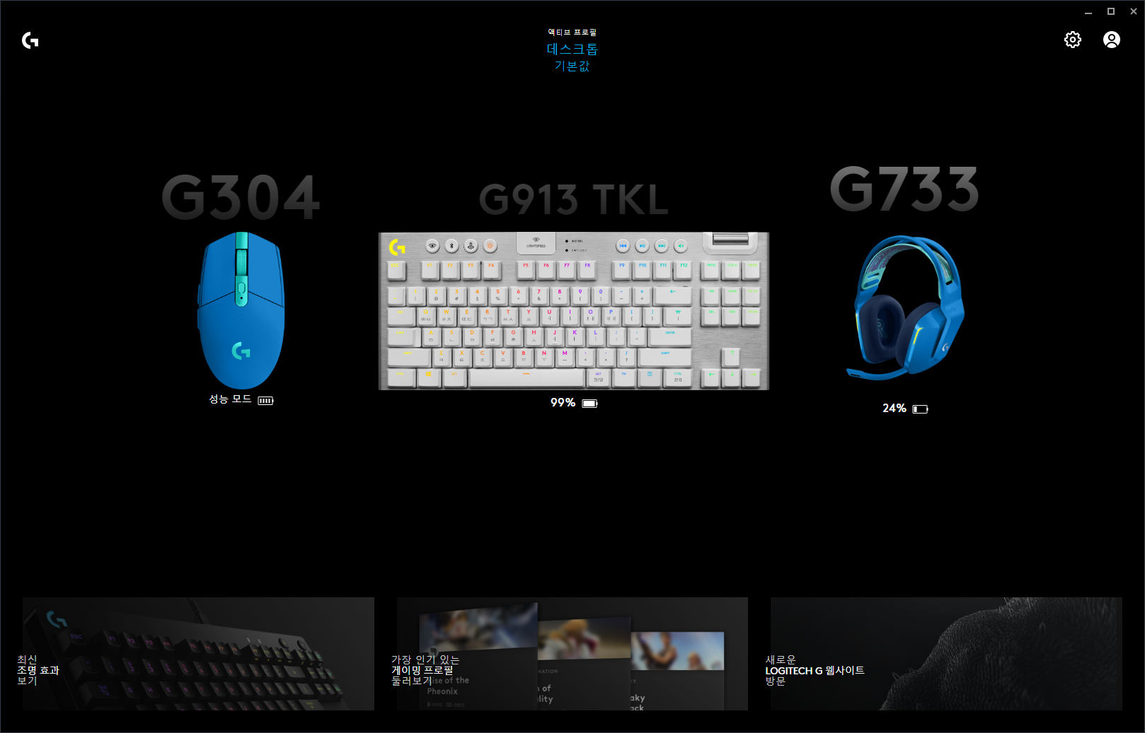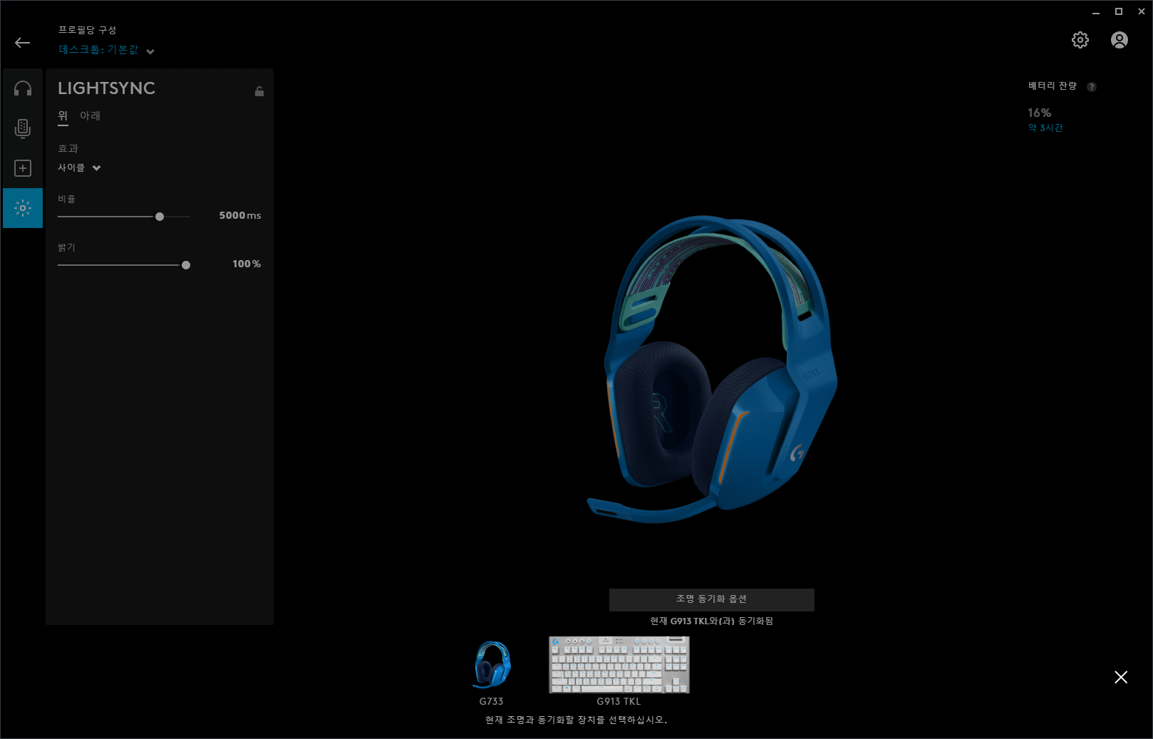 게이밍헤드셋 G733과 게이밍 키보드 G913 TKL 화이트의 LIGHTSYNC 설정을 통해서 동기화하였습니다. 동일한 RGB 색상이 마치 하나의 세트로 변하는 게 멋집니다.