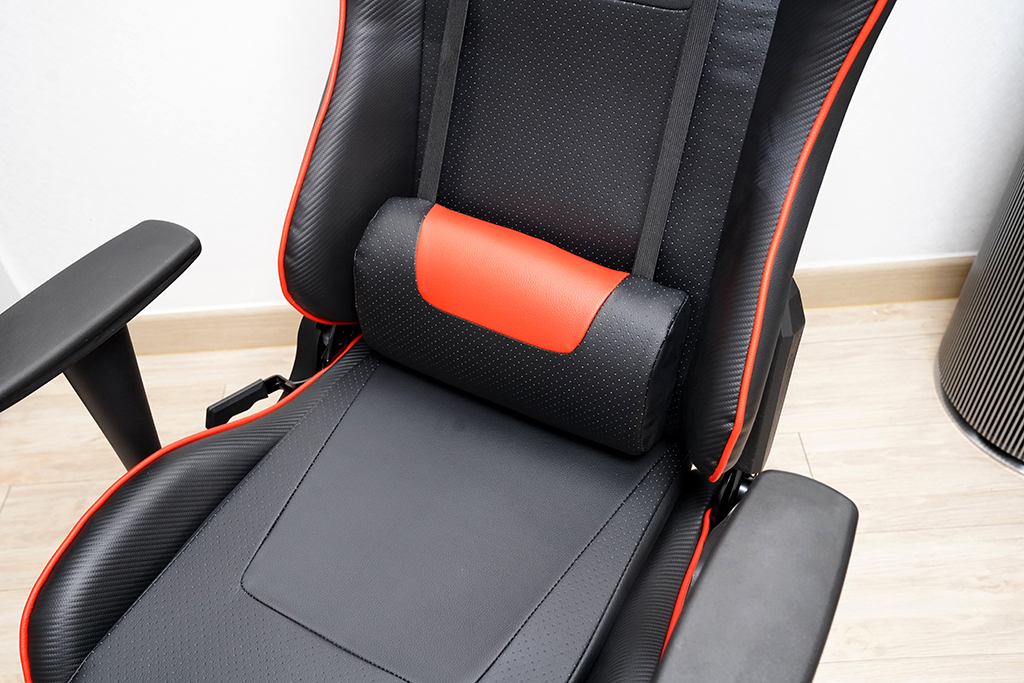 전체적으로 게이밍의자라 앉았을 때 레이싱카 의자처럼 쏙 들어가는 맛이 있습니다. 또 요추 등받이와 목 등받이가 있어 사용이 가능합니다.