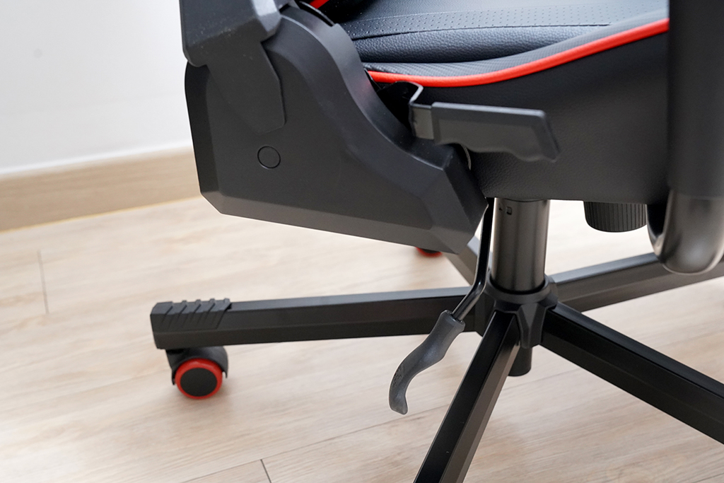전체적인 외형은 고급 게이밍의자와 디자인은 비슷합니다. 가죽 재질에 색상이 블랙, 레드라 강렬하고 마음에 듭니다.
