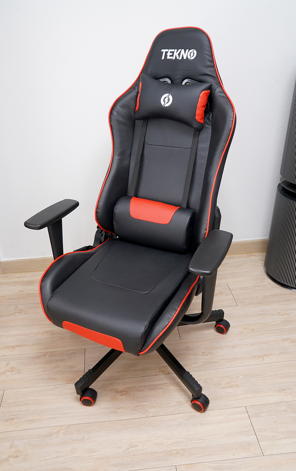 TEKNO 테크노 브랜드 제품으로 가격대비해서 저렴한 축에 드는 게이밍의자 입니다. 그래도 요추 등받이가 있어 엉덩이 쪽이 쿠션으로 편합니다.
