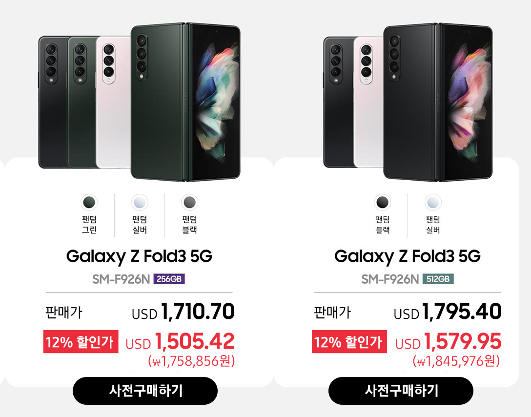 갤럭시 Z 폴드3 가격은 256GB 모델이 199만 8천700원, 512GB 모델이 209만 7천700원 입니다. 색상은 256GB 폴드3 모델은 팬텀 블랙, 팬텀 그린, 팬텀 실버의 3가지 색상이고, 폴드3 512GB 모델은 팬텀 블랙, 팬텀 실버의 2가지 색상입니다.